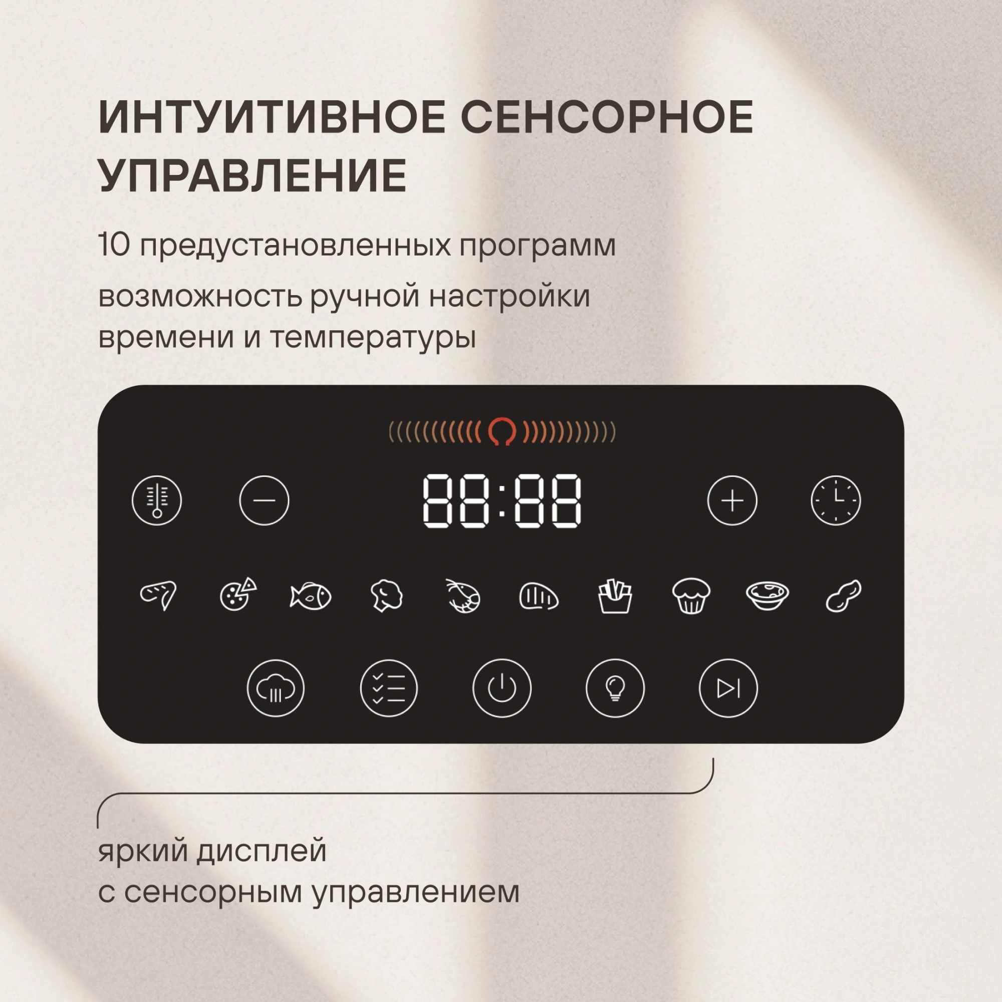 Cенсорное управлением, 10 популярных автоматических программ, ручной режим, для самостоятельной установки температуры и время приготовления.