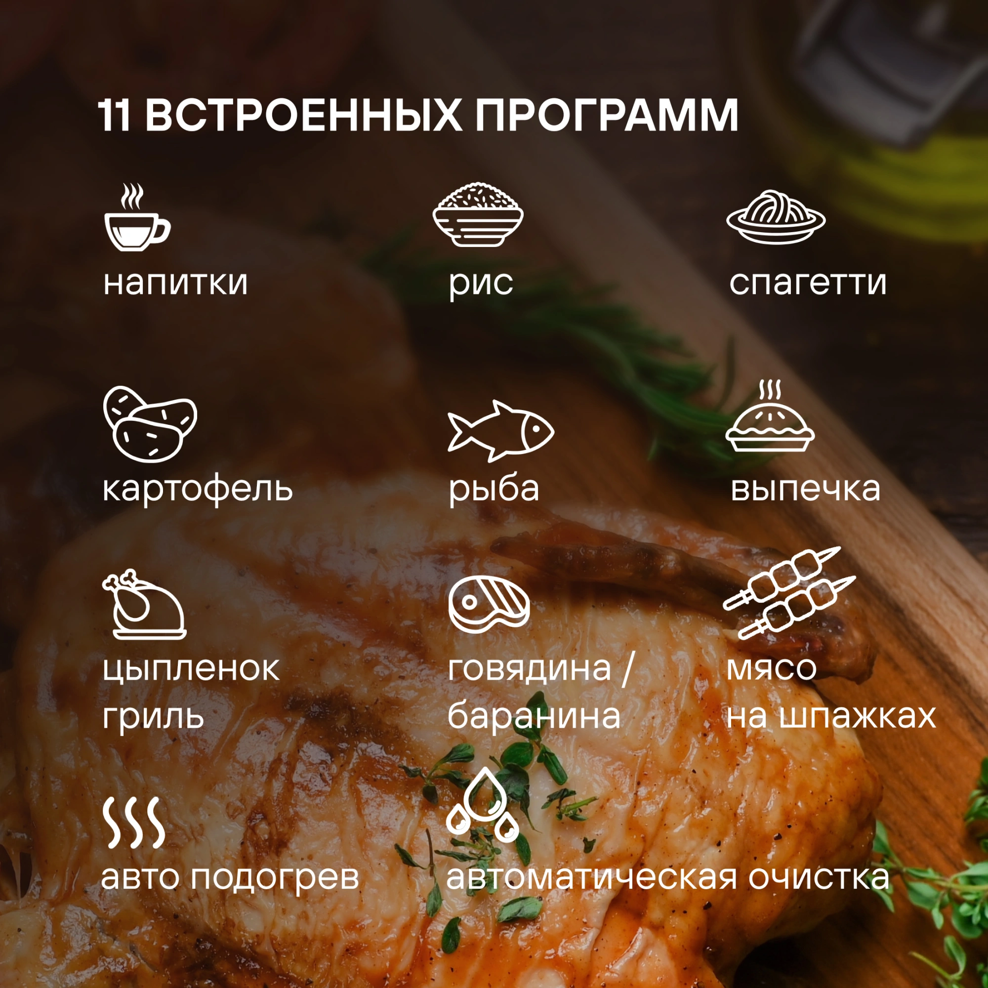 функция аэро-гриль, Стекло дверцы полноразмерное,Напитки Рис Спагетти Картофель Авто подогрев Рыба Выпечка Цыпленок гриль Говядина / Баранина Мясо на шпажках Автоматическая очистка